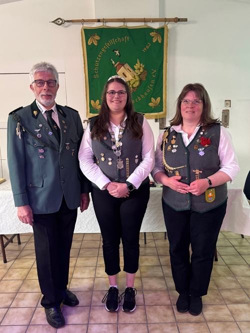 Die Veranstaltung begann mit einem Festkommers. Präsident Frank Heitmeyer begrüßte die Anwesenden. Dann wurde die neue Königin proklamiert. Zum vierten Mal in Folge gelang es einer Frau, den Holzadler von der Wand zu holen. Für die Jahre 2025/26 ist die neue Majestät Alina Dettmer. Brockhauser Männer, strengt euch an!(von links: Vizepräsident W. Thurau, Majestät 2025/2026 A. Dettmer, Majestät 2024/2025 S. Heitmeyer)