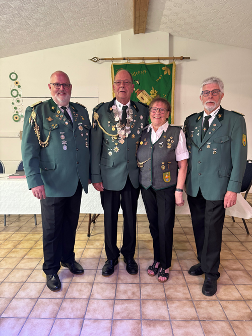 Joachim Matthey, der stellvertretende Präsident des Osnabrücker Schützenbundes und Brockhauser Vereinsmitglied, sprach anschließend einige Grußworte und nahm besondere Ehrungen vor. Anne Ventker bekam die goldene Verdienstnadel des Bezirksschützenverbandes. Langjährige Mitglieder erhielten die Treuenadel des DSB. Für 25jährige Mitgliedschaft war das Hans Jacobmeyer, für 40 Jahre Gilbert Crochemore, Nicole Jacobmeyer, Erwin Jösting, Jessica Kuhlmann und Harald Rogowski.. Für 60jährige Mitgliedschaft im DSB wurde Friedel Jacobmeyer ausgezeichnet.